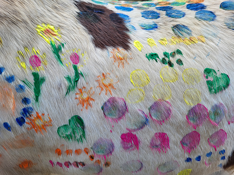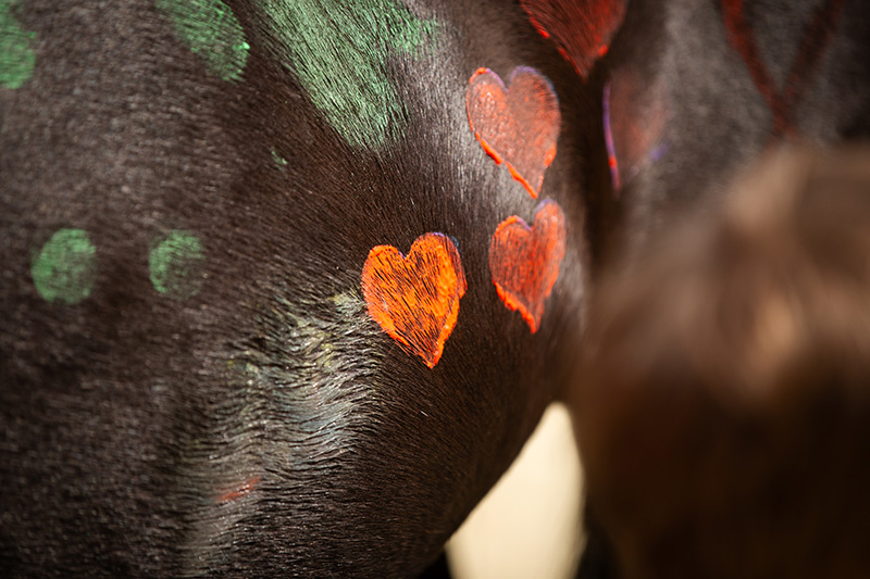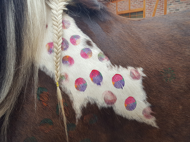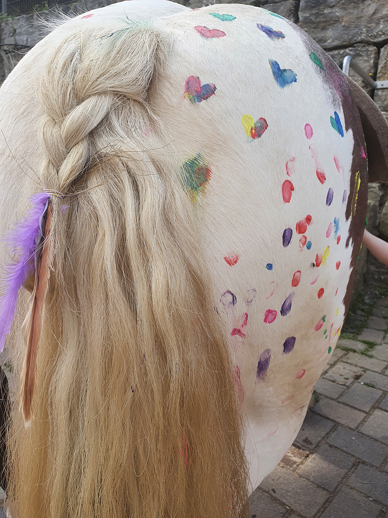 Das Bild ist eine Nahaufnahme des hellen Fells eines Pferdes, das vollständig mit bunten Motiven wie Herzen, Blumen und Punkten bemalt ist.
