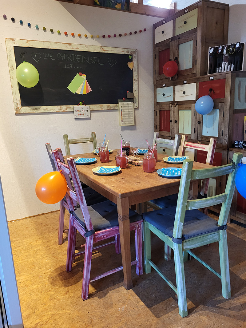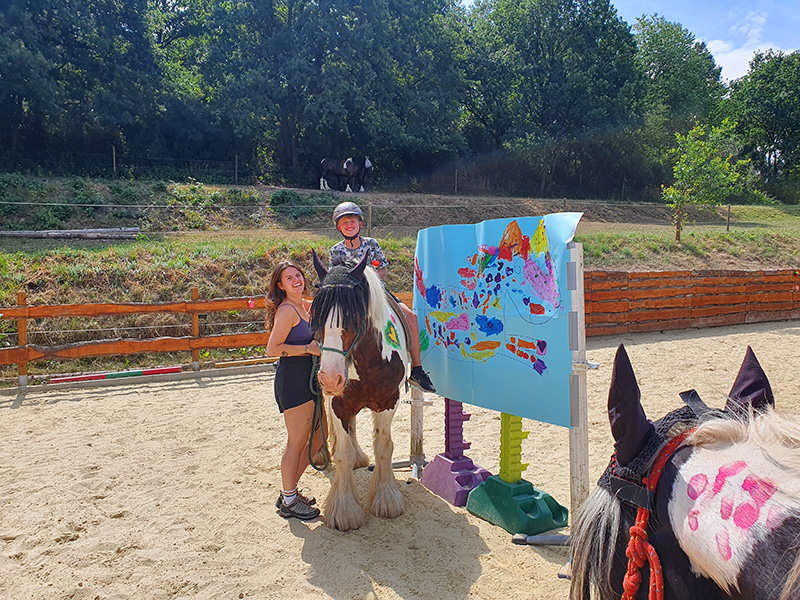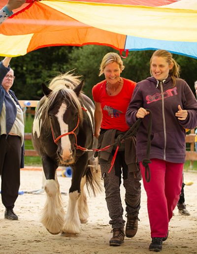 Ein Mädchen mit Helm sitzt auf einem großen, braun-weiß gescheckten Pferd, während eine junge Frau lächelnd das Pferd am Zügel hält. Die Gruppe steht auf einem sandigen Reitplatz neben einer bunten, bemalten Tafel, was auf eine therapeutische oder spielerische Reitaktivität hindeutet.