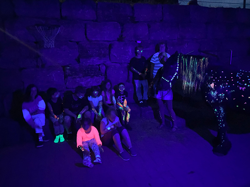 Eine Gruppe von etwa zwölf Menschen, darunter mehrere Kinder, sitzt und steht im Dunkeln vor einer Steinmauer, wobei ihre Kleidung und Körperbemalung durch Schwarzlicht in leuchtenden Neonfarben strahlt.