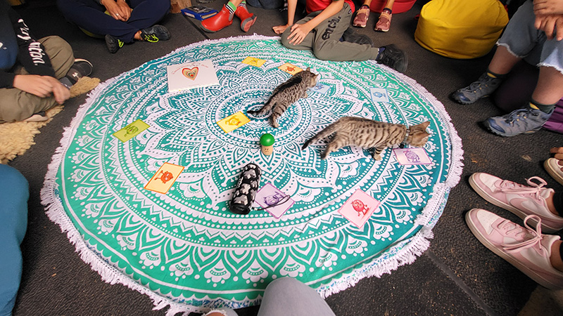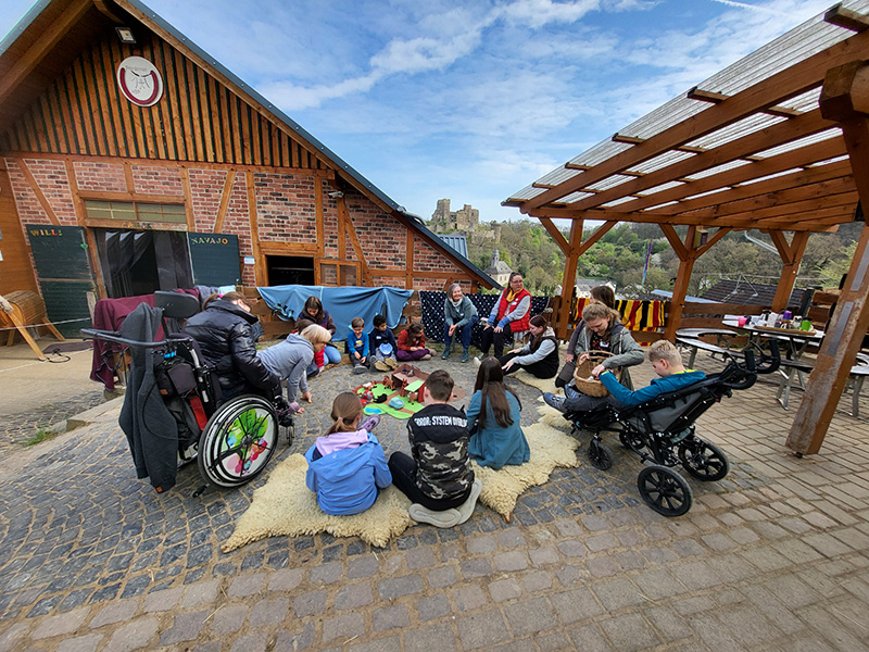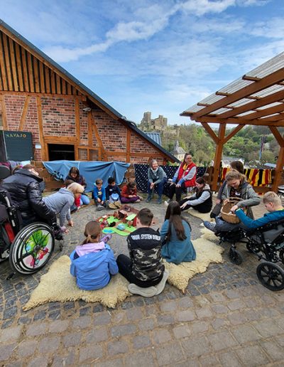 Mehrere Kinder und Erwachsene sitzen im Kreis um ein großes, rundes, türkis-weißes Tuch