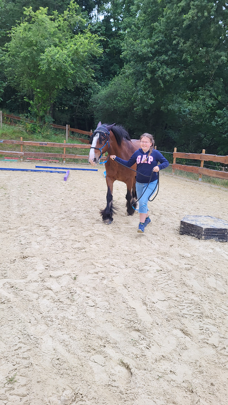 Ein Mädchen führt auf einem sandigen Reitplatz ein großes, braunes Pferd mit breiter weißer Blesse am Zügel, während sie fröhlich lächelnd auf den Betrachter zugeht. Im Hintergrund sind ein Holzzaun und dichte grüne Bäume zu sehen.