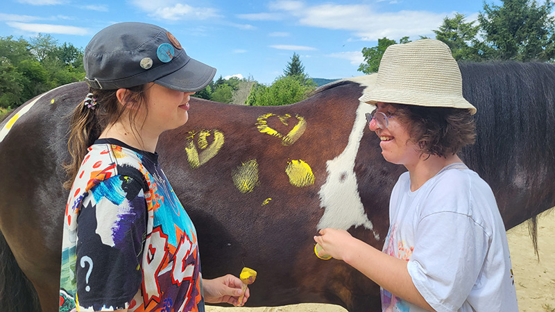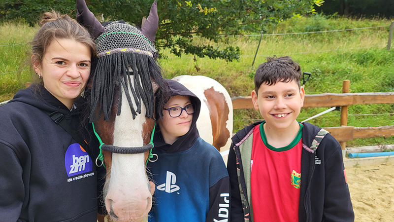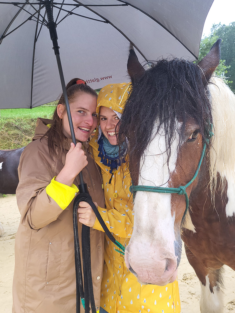 Zwei lächelnde Jugendliche stehen eng beieinander mit einem Pferd in der Mitte, wobei beide es mit den Händen berühren. Das Pferd trägt eine schwarze Fliegenmütze und eine gelbes Geschirr, und die Jugendlichen tragen jeweils eine Kappe.