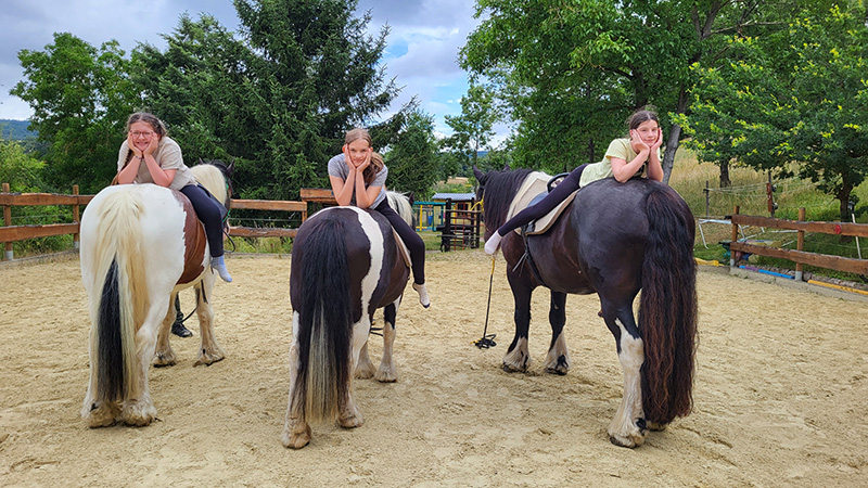 Drei Mädchen liegen entspannt auf dem Rücken von drei kräftigen Pferden