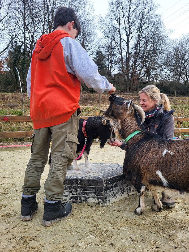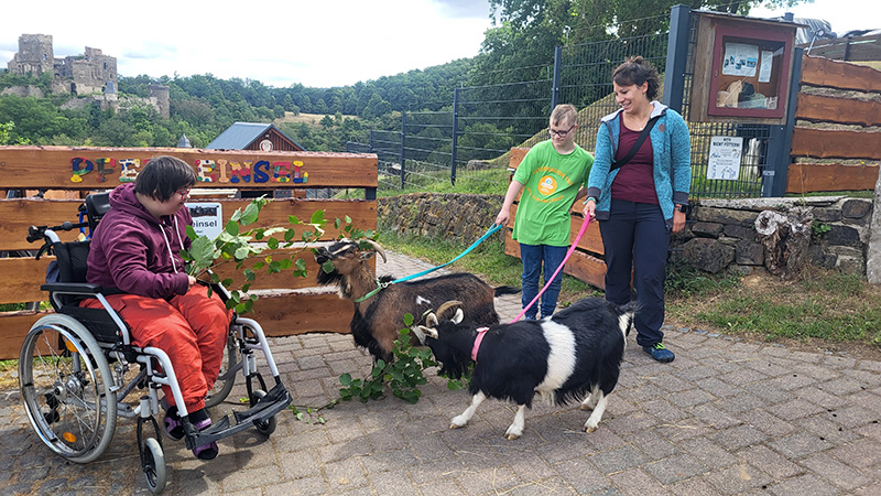 Drei Personen, eine davon im Rollstuhl, interagieren mit zwei Ziegen.