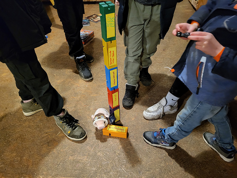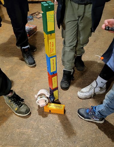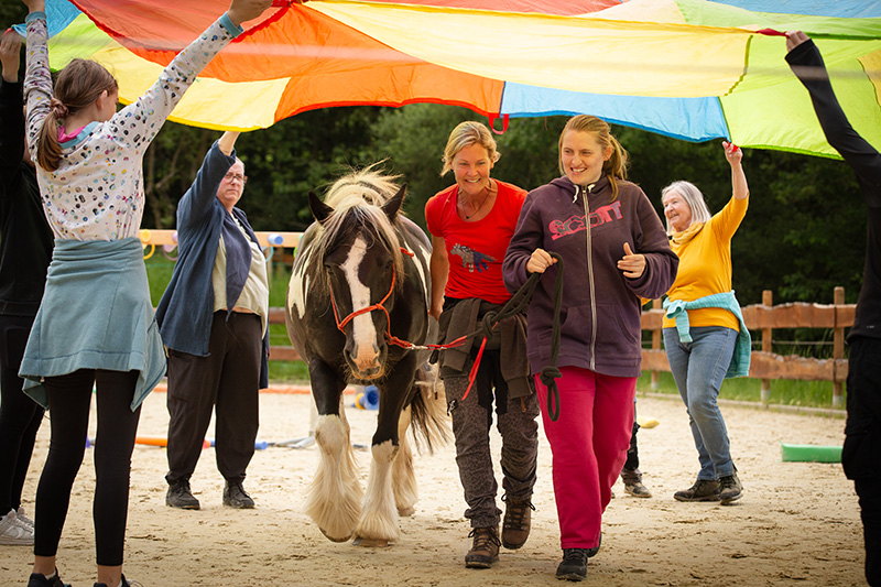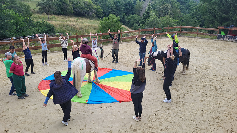 Eine Gruppe von etwa 15 Personen steht in einem Kreis um ein großes, farbenfrohes Schwungtuch.
