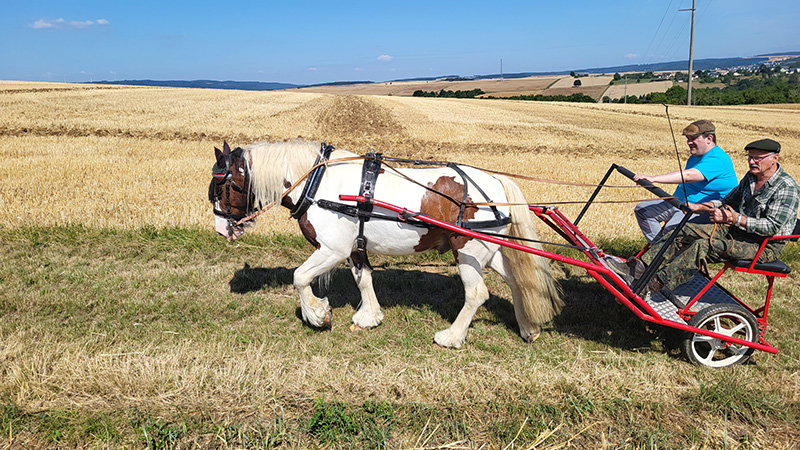 Ein braun-weiß geschecktes Pony zieht einen zweirädriger Wagen über einen Feldweg, auf dem zwei Männer sitzen und das Gespann lenken. Die Szene spielt an einem sonnigen Tag neben einem großen, abgeernteten Getreidefeld mit ländlicher Bebauung im Hintergrund.