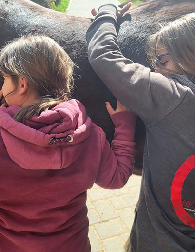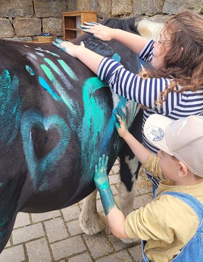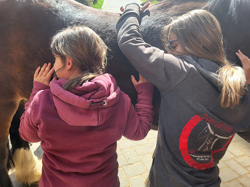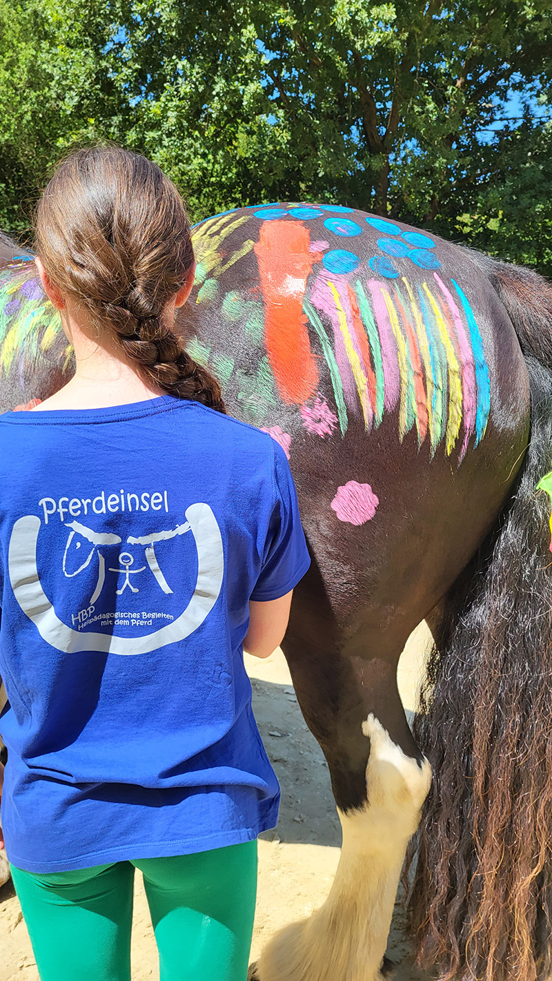 Eine junge Person mit einem geflochtenen Zopf und einem blauen T-Shirt mit dem Aufdruck "Pferdeinsel" steht mit dem Rücken zum Betrachter. Sie blickt auf das Hintere Teil eines dunklen Pferdes, dessen Fell mit bunten Farben und Mustern bemalt ist.