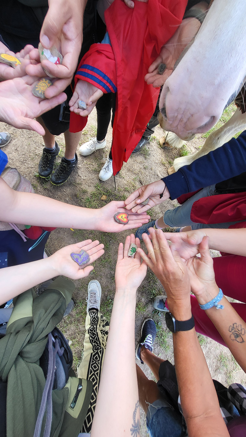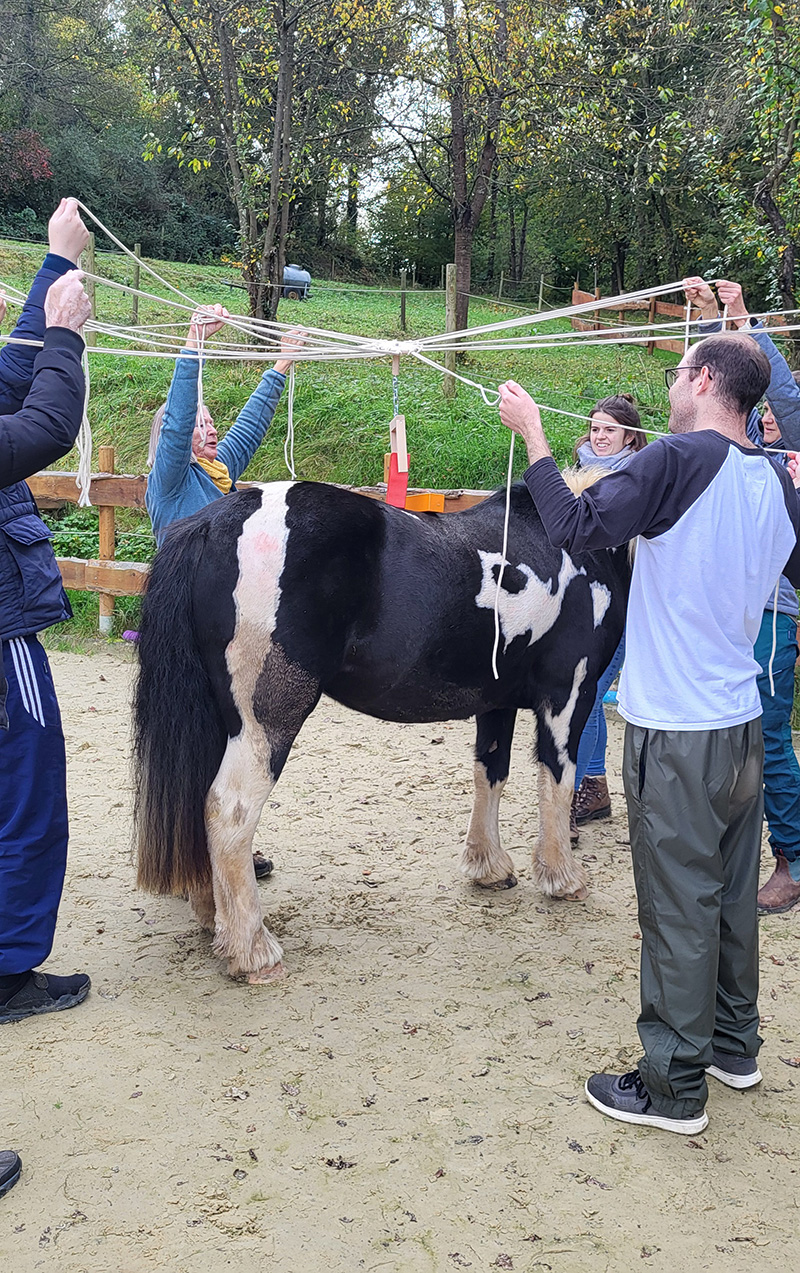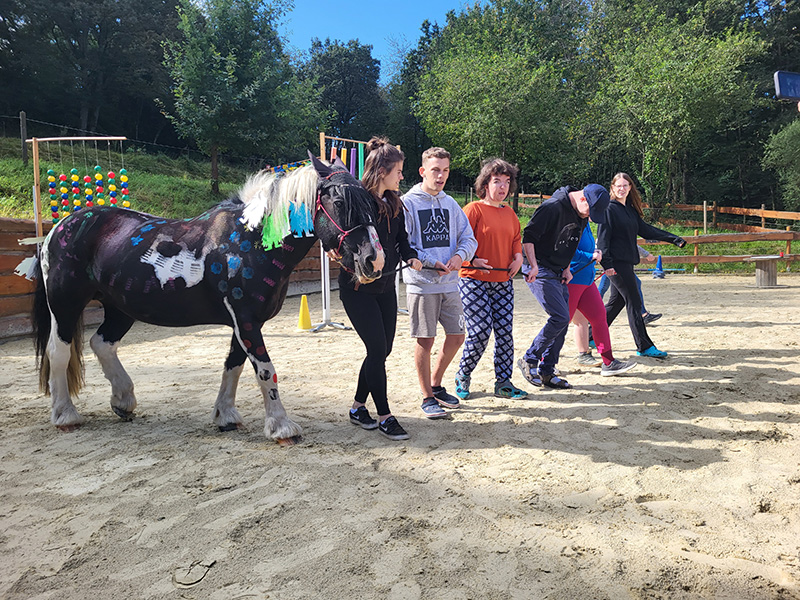 eine Gruppe von Menschen, die in einem Kreis um ein geschecktes Pferd stehen