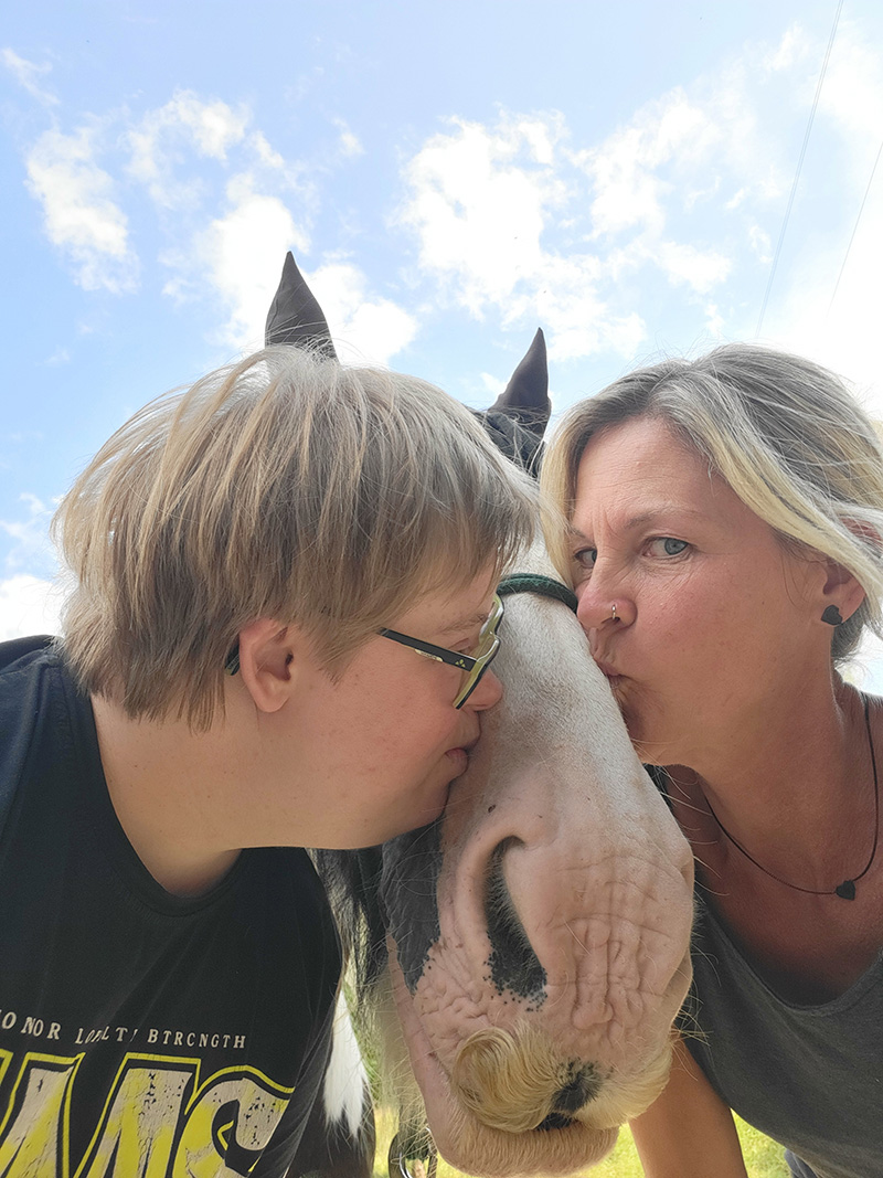 Ein Kind und eine erwachsene Frau küssen gleichzeitig ein Pferd, das im Zentrum des Bildes steht. Das Kind und die Frau neigen sich von links und rechts dem Pferdekopf zu, während sie unter einem blauen Himmel im Freien stehen.