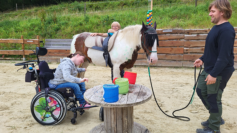 Eine junge Person sitzt in einem Rollstuhl auf einem sandigen Reitplatz neben einem gescheckten Pferd, das von einer weiteren Person auf seinem Rücken geritten wird. Ein Mann hält das Pferd an einer Leine, während das Tier an einem Tisch mit bunten Eimern steht, was auf eine therapeutische Reitstunde hinweist.