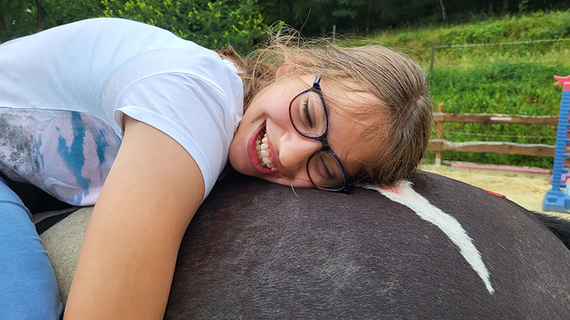 Eine junge Person mit Brille liegt lächelnd und glücklich bäuchlings auf dem Rücken eines dunklen Pferdes und schmiegt sich an dessen Fell. Die Szene, die Vertrauen und Zuneigung zeigt, spielt im Freien auf einem Reitplatz.