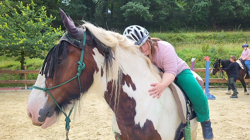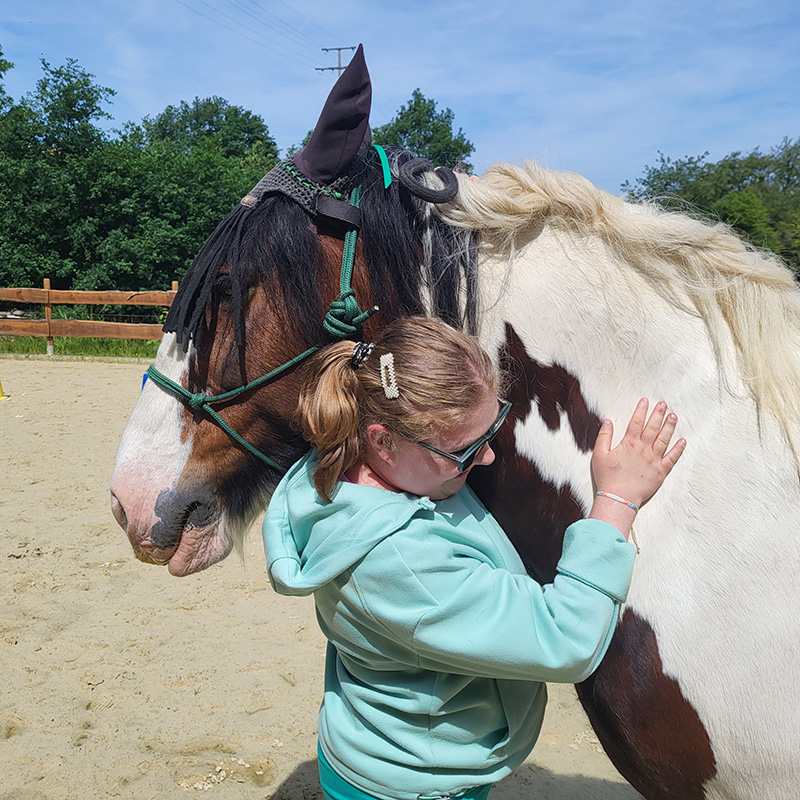 Eine reitende Person mit Helm umarmt fest den Hals eines großen, braun-weiß gescheckten Pferdes mit heller Mähne, wobei sie ihren Kopf liebevoll auflegt. Die Szene spielt auf einem sandigen Reitplatz im Freien, umgeben von grüner Vegetation.