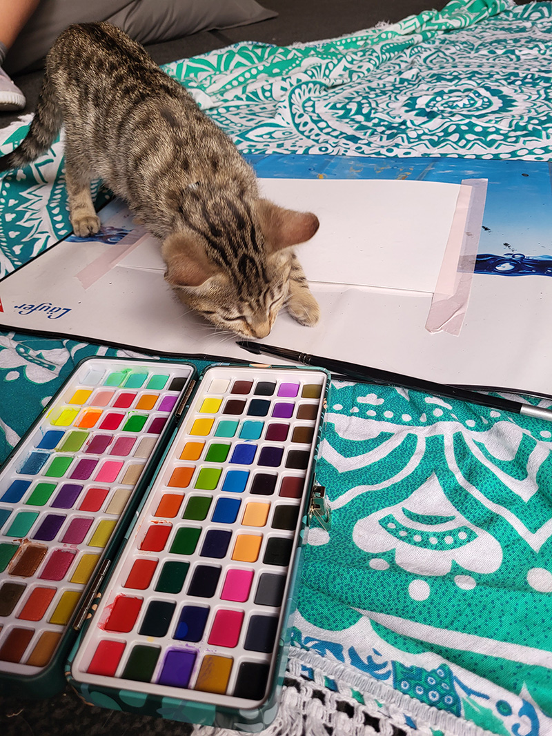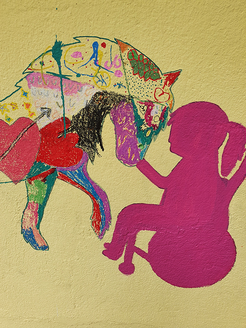 Eine junge Person mit einem Reithelm und einem rosafarbenen Oberteil konzentriert sich darauf, mit einem kleinen Stift auf ein großes, hellblaues Plakat zu malen, das bereits mit bunten, abstrakten Mustern bedeckt ist.