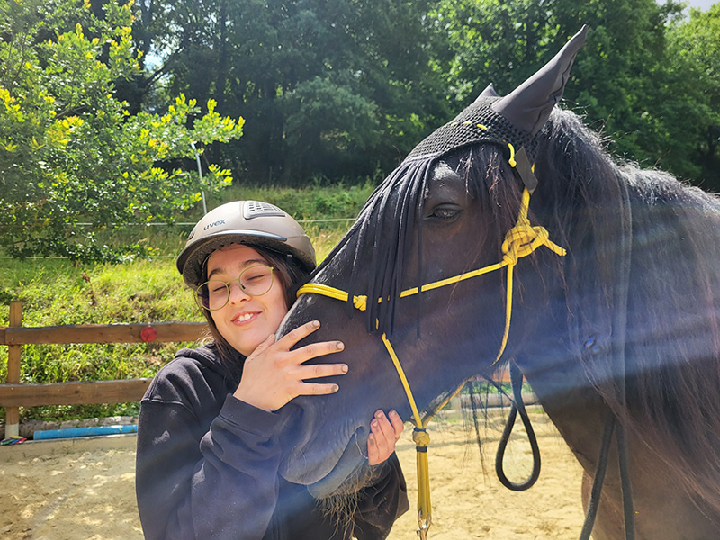 Eine junge Person mit Helm und Brille umarmt liebevoll den Kopf eines schwarzen Pferdes, das eine schwarze Fliegenmaske und ein gelbes Halfter trägt.