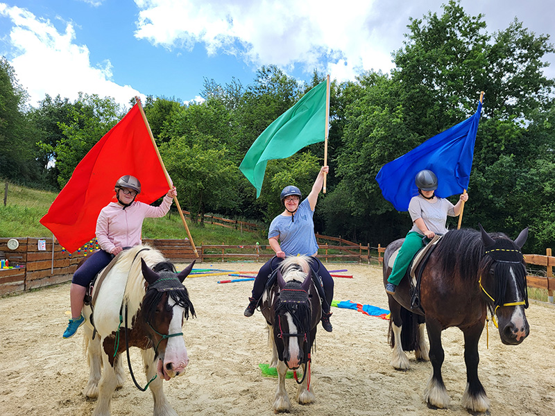 Drei Reiterinnen auf drei Pferden reiten nebeneinander auf einem Sandplatz und schwenken jeweils eine große Fahne