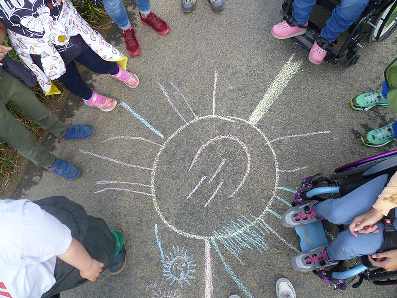 große, bunte Sonne mit Kreide gezeichnet