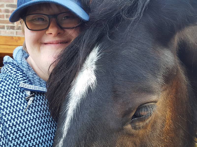 Eine lächelnde Person mit Brille und blauer Baseballkappe schmiegt sich eng an den Kopf eines dunkelbraunen Pferdes.