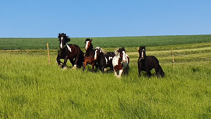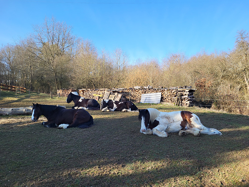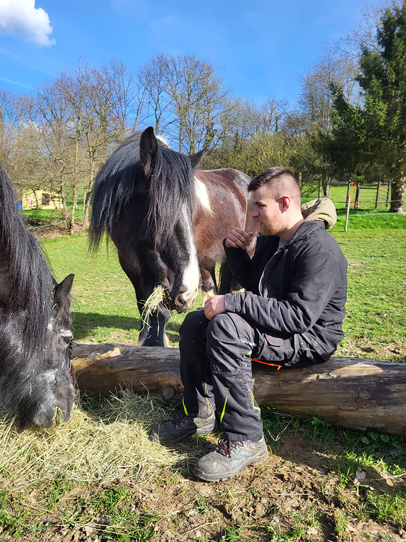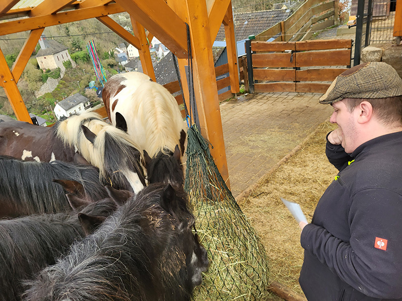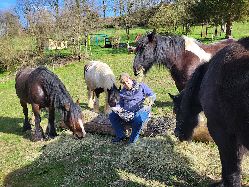 Ein Mann sitzt im Freien auf einem Baumstamm, umgeben von vier großen Pferden, die alle Heu fressen, das auf dem Boden liegt. Die Szene findet auf einer grünen, leicht abfallenden Wiese mit Bäumen und einem Spielgerät im Hintergrund unter blauem Himmel statt.