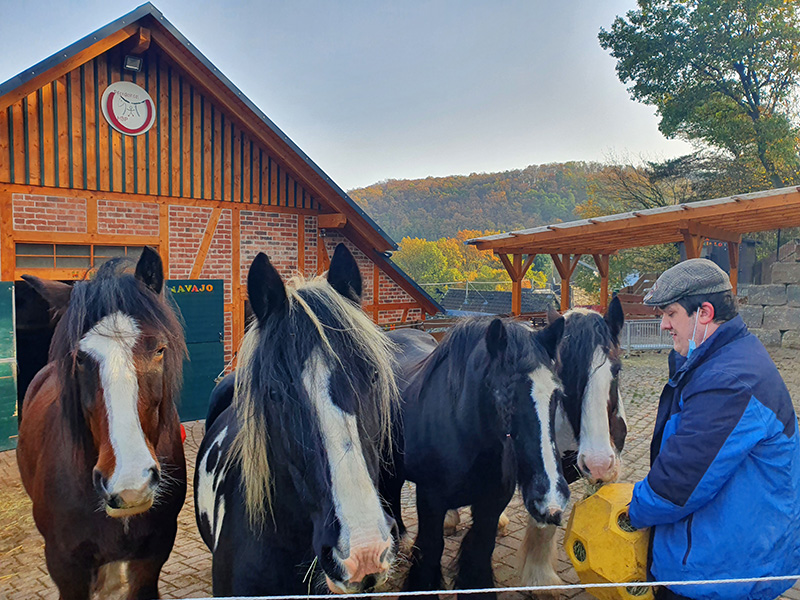 Ein Mann in einer blauen Jacke und einer grauen Mütze füttert vier Pferde
