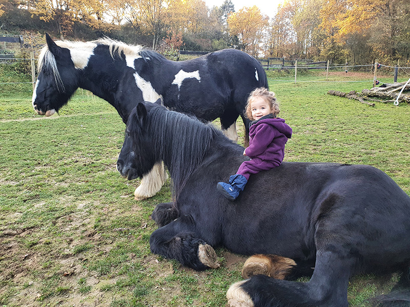 Ein kleines Kind in einer lila Jacke sitzt auf dem Rücken eines großen, schwarzen Pferdes, das entspannt auf einer grünen Koppel liegt. Direkt dahinter steht ein weiteres großes Pferd mit schwarz-weiß geschecktem Fell