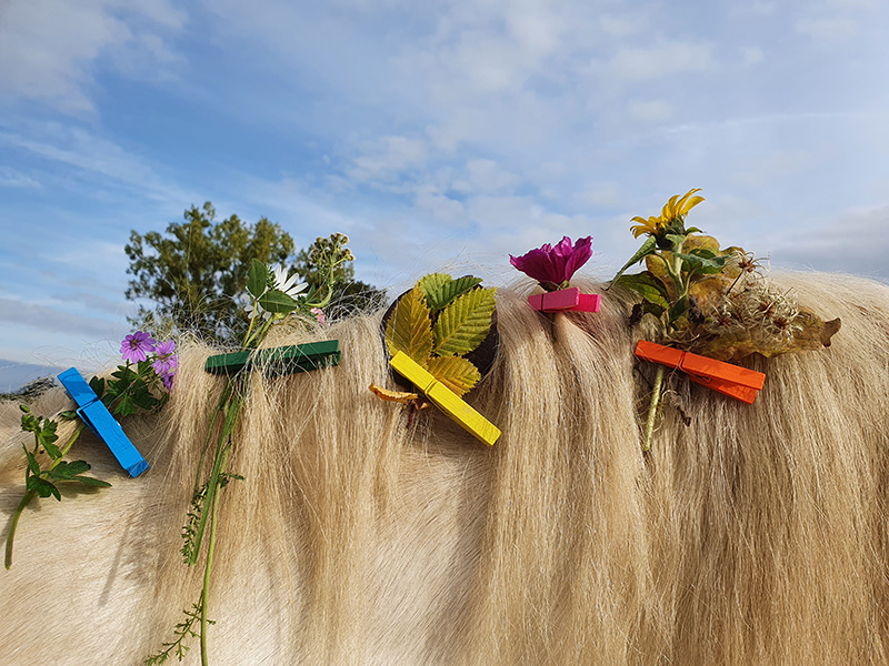 Helle Mähne eines Pferdes, die liebevoll mit bunten Wäscheklammern und frischen Sommerblumen und Gräsern dekoriert ist.
