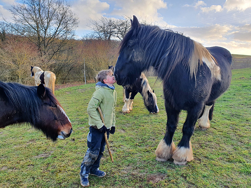 in kleiner Junge in einer hellgrünen Jacke steht auf einer Wiese und berührt liebevoll die Nase eines großen, dunklen Pferdes mit einer weißen Mähne. Er ist von mehreren Pferden umgeben, die im sanften Abendlicht grasen.