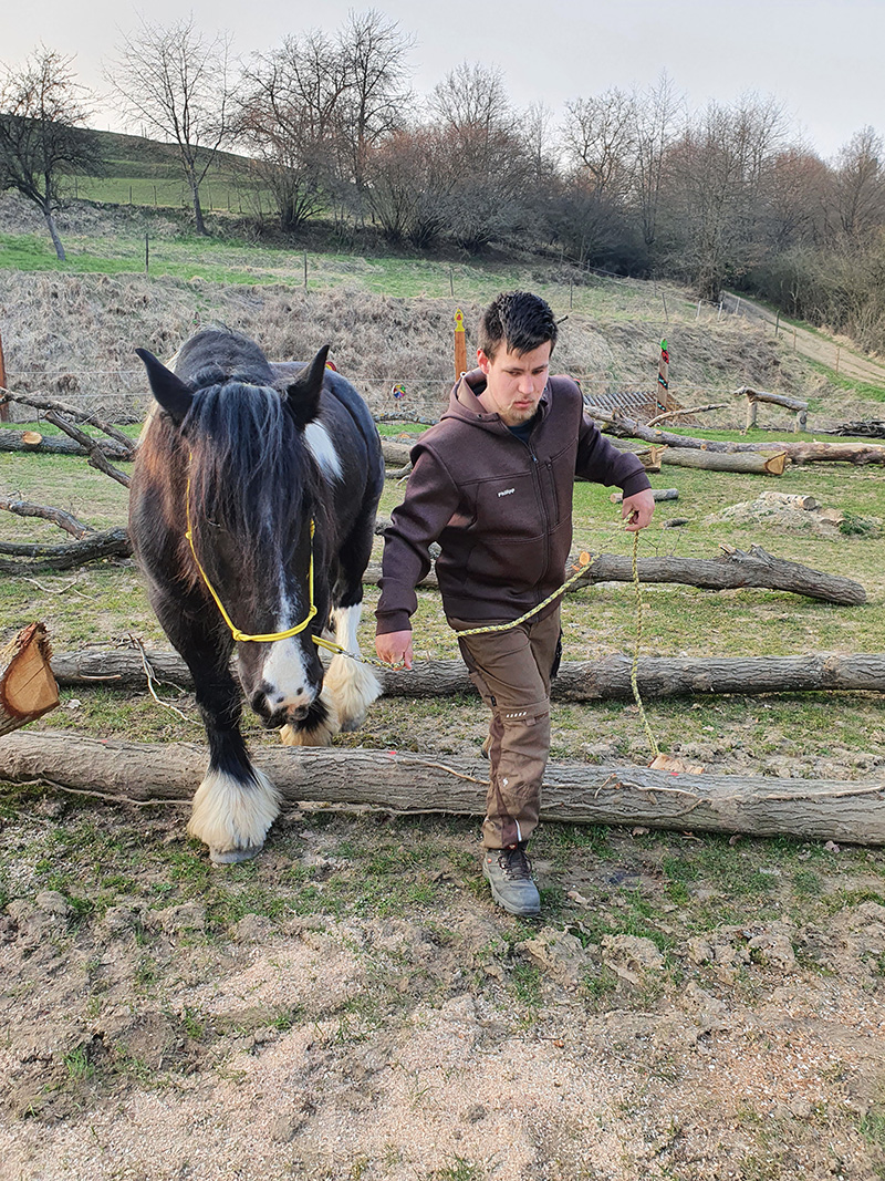 Ein junger Mann in Arbeitskleidung führt ein großes, dunkelbraunes Pferd mit weißen Fesseln und gelbem Halfter über mehrere liegende Baumstämme. Die Szene findet auf einer leicht hügeligen Wiese mit Bäumen und einem Zaun im Hintergrund statt.