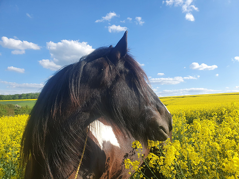 Das Bild zeigt eine Hand die gelb bemalt ist für einen künstlerischen Handabdruck auf dem dunklen Fell eines Pferdes.