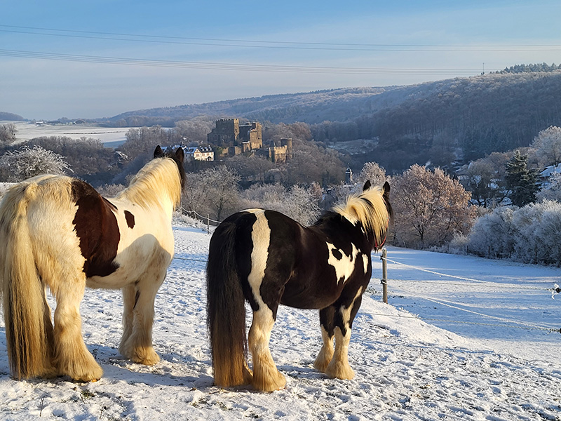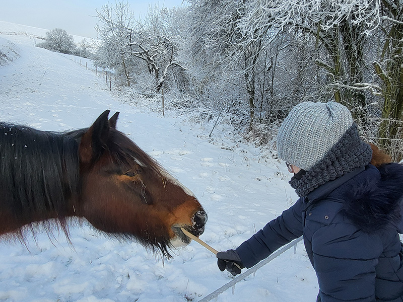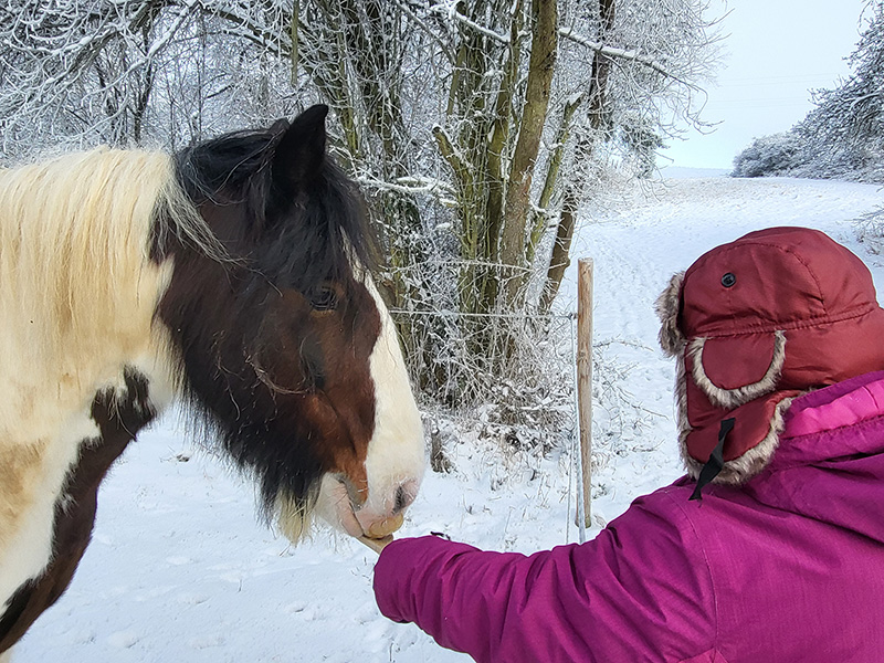 Eine Person mit einer warmen, weinroten Mütze und pinker Jacke füttert ein braun-weiß geschecktes Pferd namens Willi in einer verschneiten Winterlandschaft.