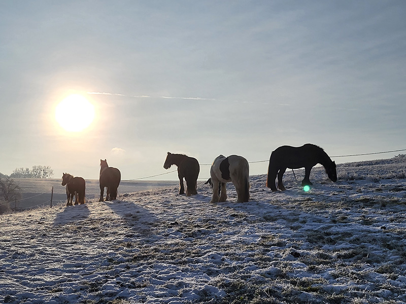 Fünf Pferde auf einem schneebedeckten Hügel