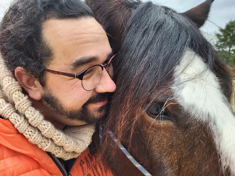 Ein Mann mit Brille und Bart schmiegt seine Wange liebevoll an den Kopf eines braunen Pferdes mit großer weißer Blesse. Es handelt sich um ein Nahaufnahme-Porträt, das die Verbundenheit zwischen dem Mann und dem Pferd zeigt.
