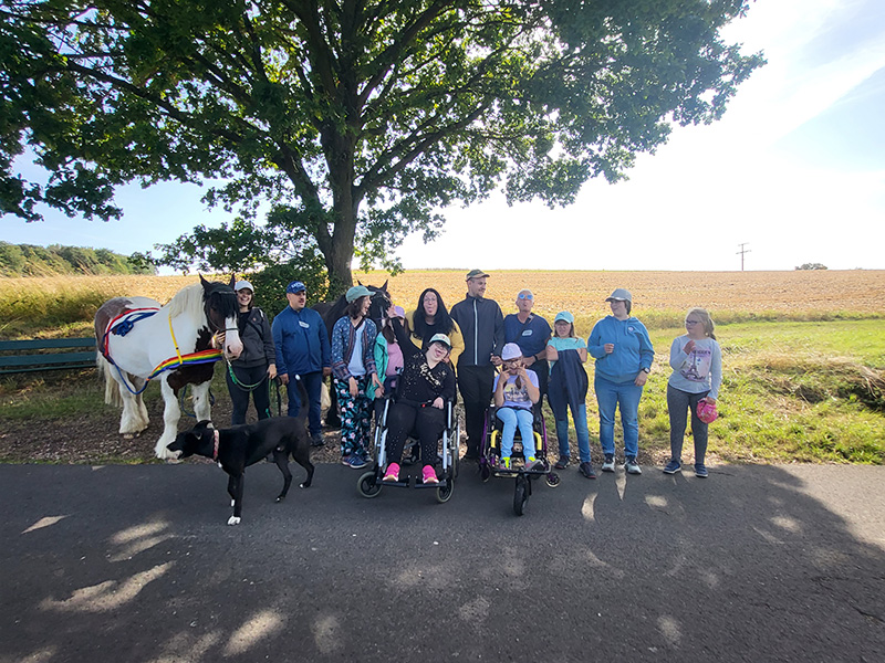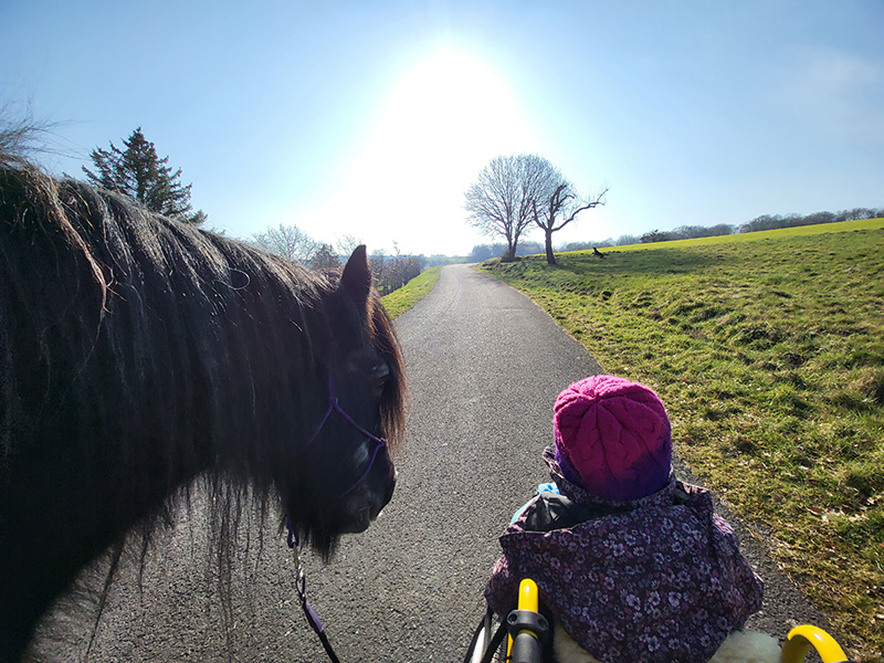 Ein kleines Kind mit einer lila Mütze sitzt in einem Rollstuhl und blickt auf einen dunklen Ponykopf, der sich von links nähert. Die Szene zeigt die beiden auf einem asphaltierten Weg, der durch grüne Felder führt, mit strahlendem Sonnenschein von oben.