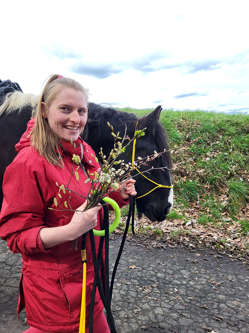 Eine junge Frau in einer leuchtend roten Jacke lächelt in die Kamera und hält einen Strauß blühender Weidenkätzchen. Sie steht neben einem großen, dunklen Pferd mit einem gelben Halfter, das seinen Kopf sanft neben ihr hält.
