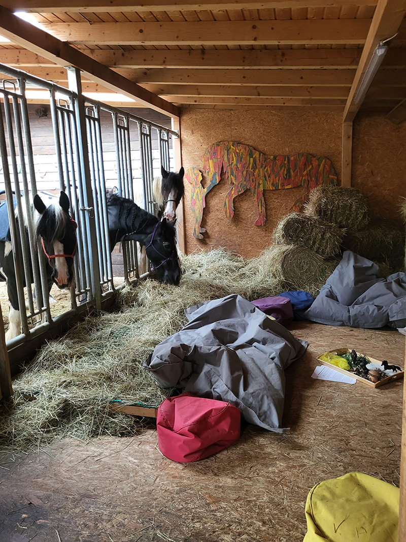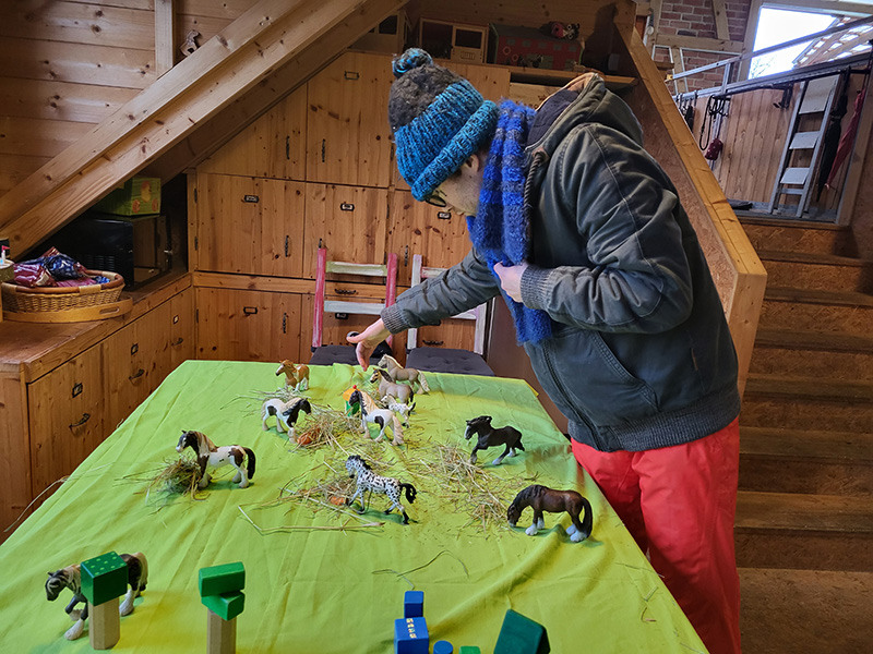 Hier ist die Bildbeschreibung: Eine Person mit blauer Mütze und Schal beugt sich über einen Tisch, auf dem sie eine Szene mit vielen kleinen Spielzeugpferden, Heu und Bauklötzen arrangiert hat. Die Szene findet in einem gemütlichen Raum mit Holzwänden und einer Holztreppe statt.