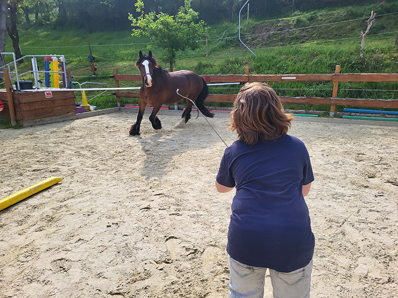 Eine Frau steht mit dem Rücken zum Betrachter in einem sandigen Reitplatz und hält eine lange, dünne Gerte. Sie blickt auf ein großes, braunes Pferd mit einer breiten weißen Blesse, das in leichtem Trab oder einer Gangart vor ihr steht. Im Hintergrund sind ein Holzzaun, grüne Vegetation und ein bewaldeter Hang zu sehen.