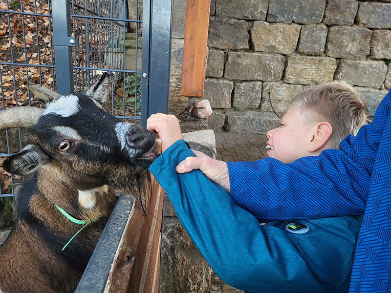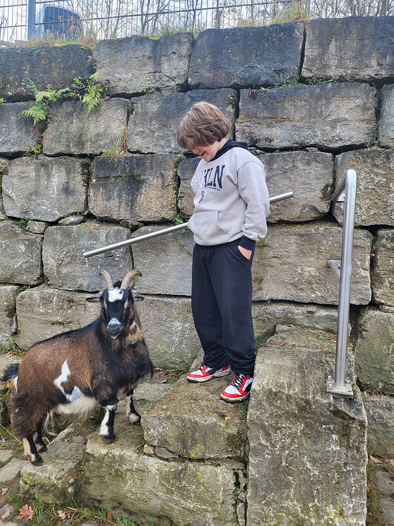 Ein lächelnder Junge in einem blauen Oberteil füttert eine braun-schwarze Ziege mit Hörnern, die ihren Kopf durch einen Zaun steckt. Die Szene spielt im Freien vor einer alten Steinmauer.