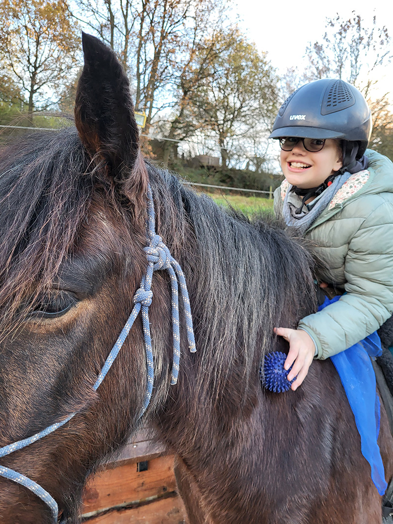 Ein Mädchen mit Reithelm und Brille sitzt lächelnd auf einem dunklen Pferd und hält eine blauen Igelball in der Hand, die auf dem Pferdehals liegt. Im Hintergrund sind Bäume und eine Wiese bei mildem Abendlicht zu sehen.