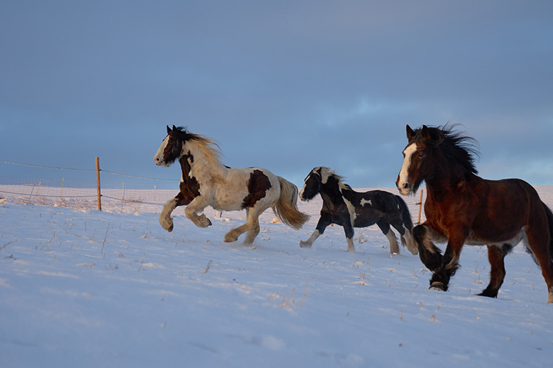 Drei Pferde galoppieren über ein tief verschneites Feld