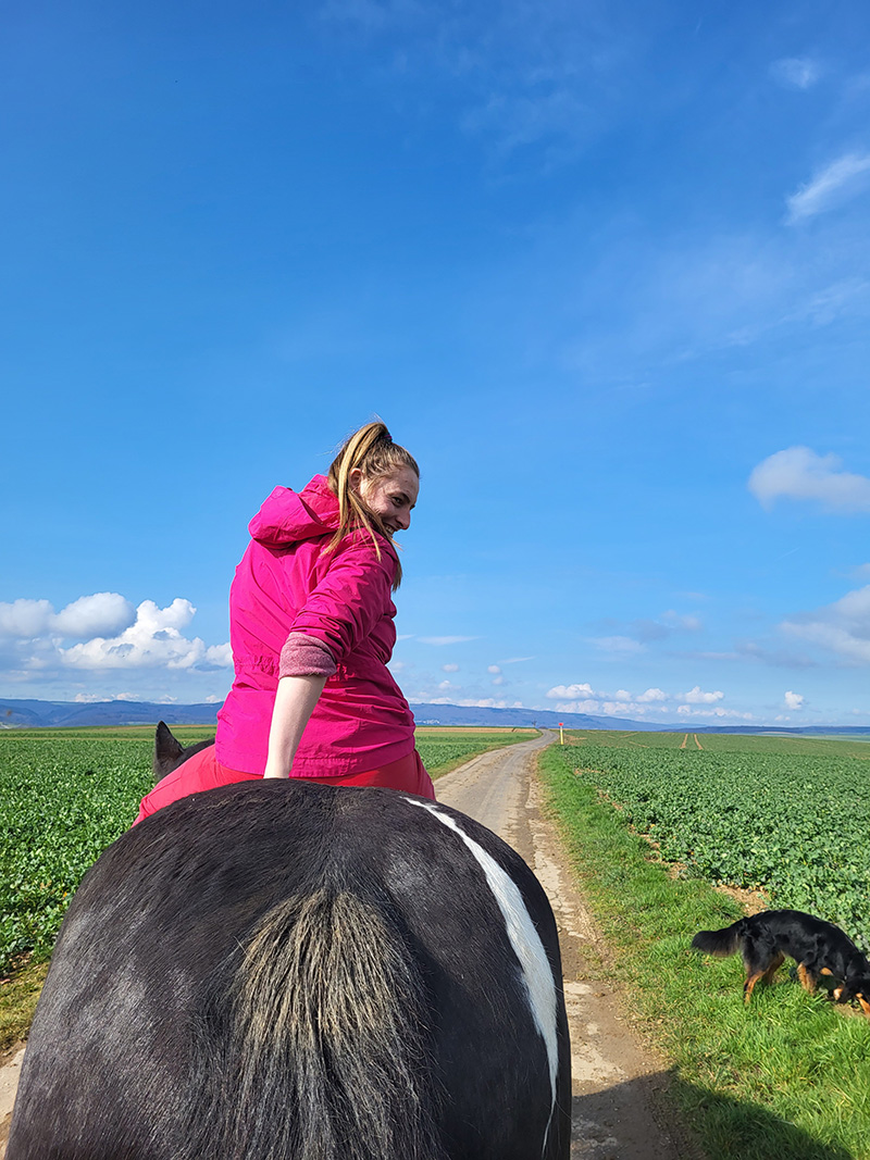 Eine lächelnde Frau in einer leuchtend pinken Jacke reitet auf einem dunklen Pferd einen Feldweg entlang.