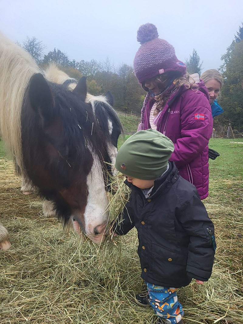 Zwei Kinder füttern ein Pferd