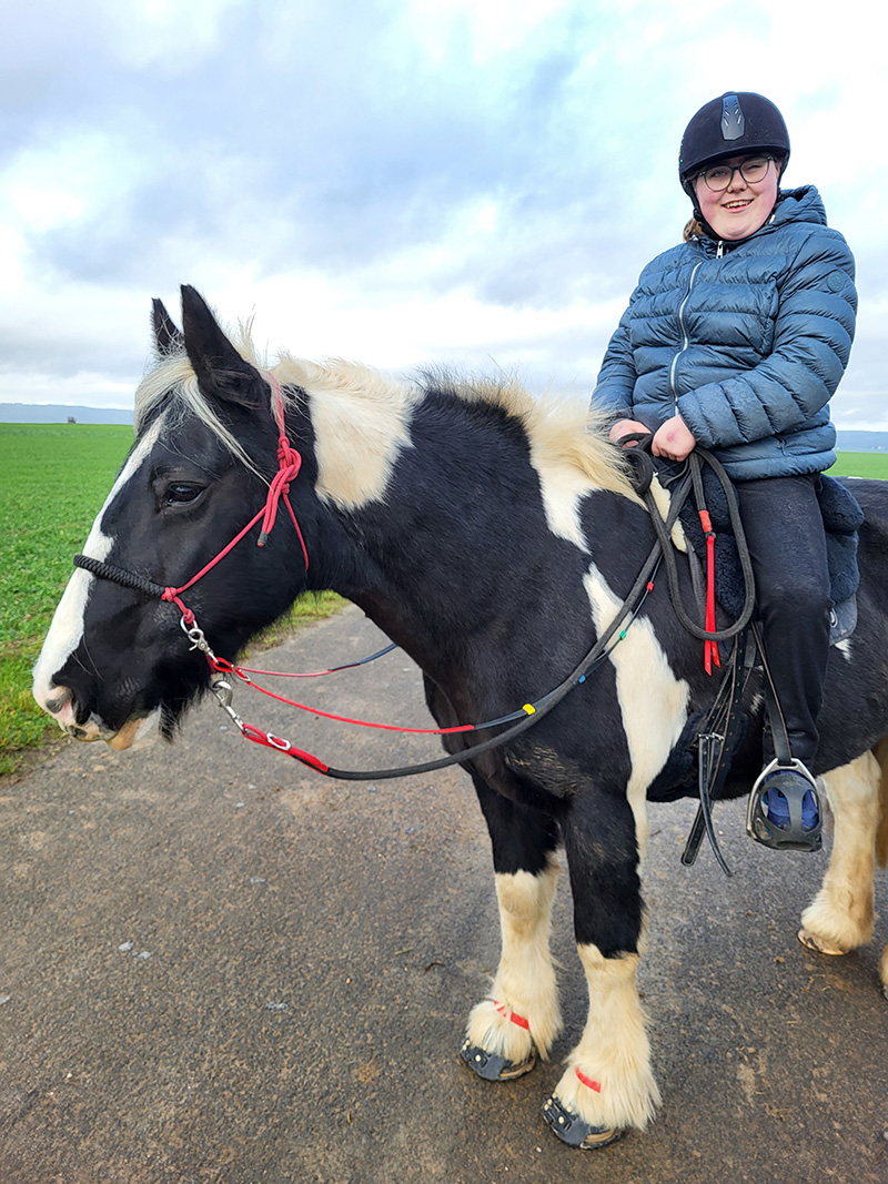 Ein Mädchen mit Helm und Brille sitzt lächelnd auf einem schwarz-weiß gescheckten Pferd.