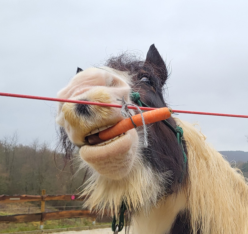 Das Bild ist eine Nahaufnahme vom Kopf des gescheckten Pferdes Willi, das auf lustige Weise eine Karotte hält