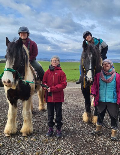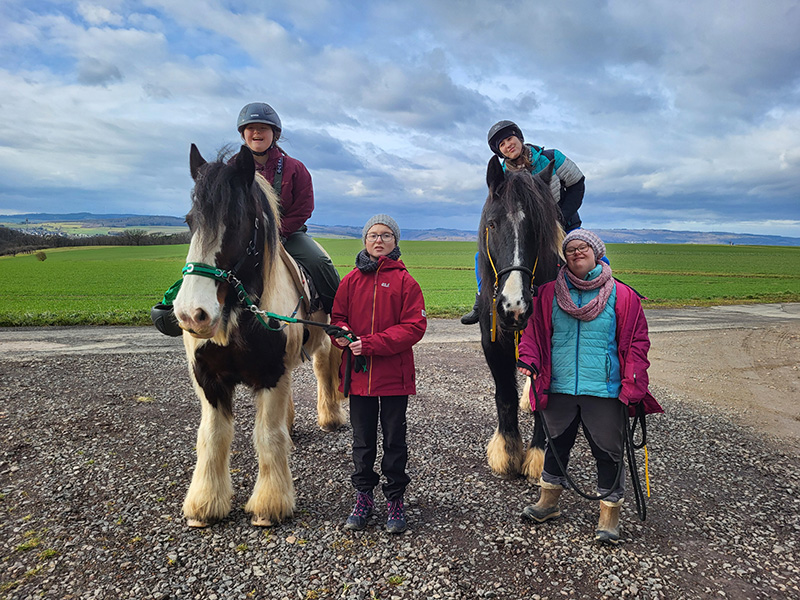 Vier Menschen, davon drei Reiterinnen mit Helm