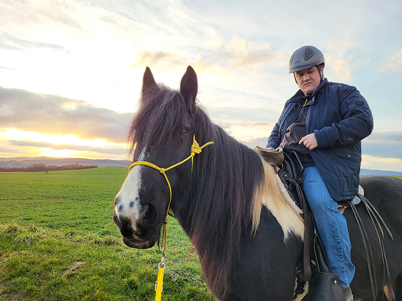 Ein Mann mit Reithelm sitzt auf einem dunklen Pferd mit einer langen Mähne und gelbem Halfter, während sie auf einer grünen Wiese stehen. Das Licht des Sonnenuntergangs oder Sonnenaufgangs erhellt den Himmel im Hintergrund.