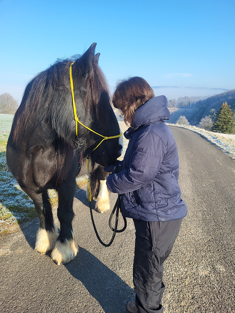 Eine Person in einer dicken, dunkelblauen Jacke steht auf einer Asphaltstraße neben einem großen, fast schwarzen Pferd mit gelbem Halfter.