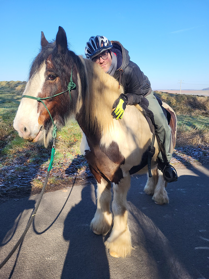 Eine lächelnde Person mit Reithelm reitet auf einem großen, braun-weiß gescheckten Pferd einen Weg entlang.