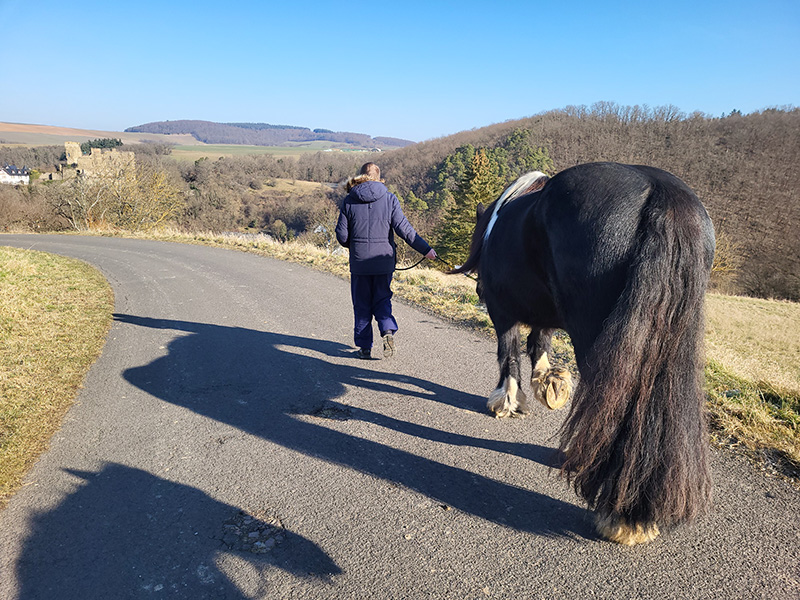 Eine Person in einer dunklen Jacke führt von hinten gesehen ein großes, dunkelbraun-weißes Pferd mit langer Mähne und Schweif auf einem sonnigen Asphaltweg entlang. Im Hintergrund erstreckt sich eine hügelige Landschaft mit Wald, Feldern und einer historischen Burg.