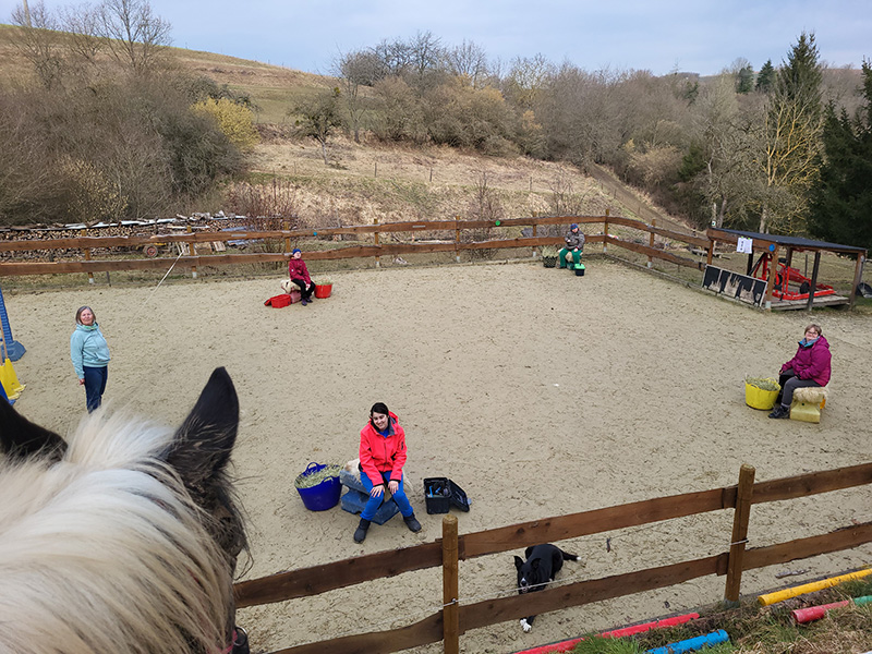 Gruppe von Menschen mit Pferden auf dem Reitplatz