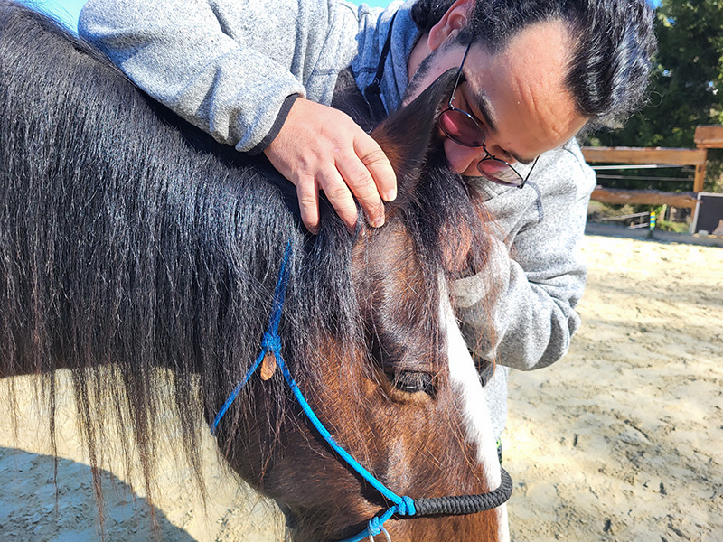 Ein Mann in einem grauen Kapuzenpullover beugt sich über den Hals eines braunen Pferdes und hält vorsichtig dessen rechtes Ohr.
