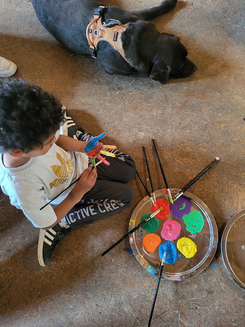 Ein Kind sitzt auf dem Boden und bemalt seine Hand mit leuchtend blauer Farbe, wobei es einen Pinsel benutzt und eine Palette mit bunten Farbtupfern vor sich hat.